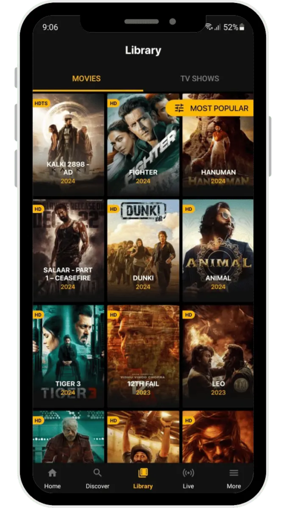 This app is loaded with a range of content, allowing viewers to watch movies or TV shows based on their preferences. The APK offers numerous genres, including action, fantasy, horror, comedy, romance, thriller, crime, documentary, sci-fi, and more, spanning from Bollywood to Hollywood. Users can indulge in content in HD quality and download movies or series for offline viewing. APP